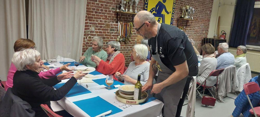 Naast de maaltijd was er ook ruimte voor gezelligheid waar iedereen onder het genot van een glaasje wijn of frisdrank bijpraatten. Het was duidelijk: iedereen voelde zich welkom en op zijn gemak.