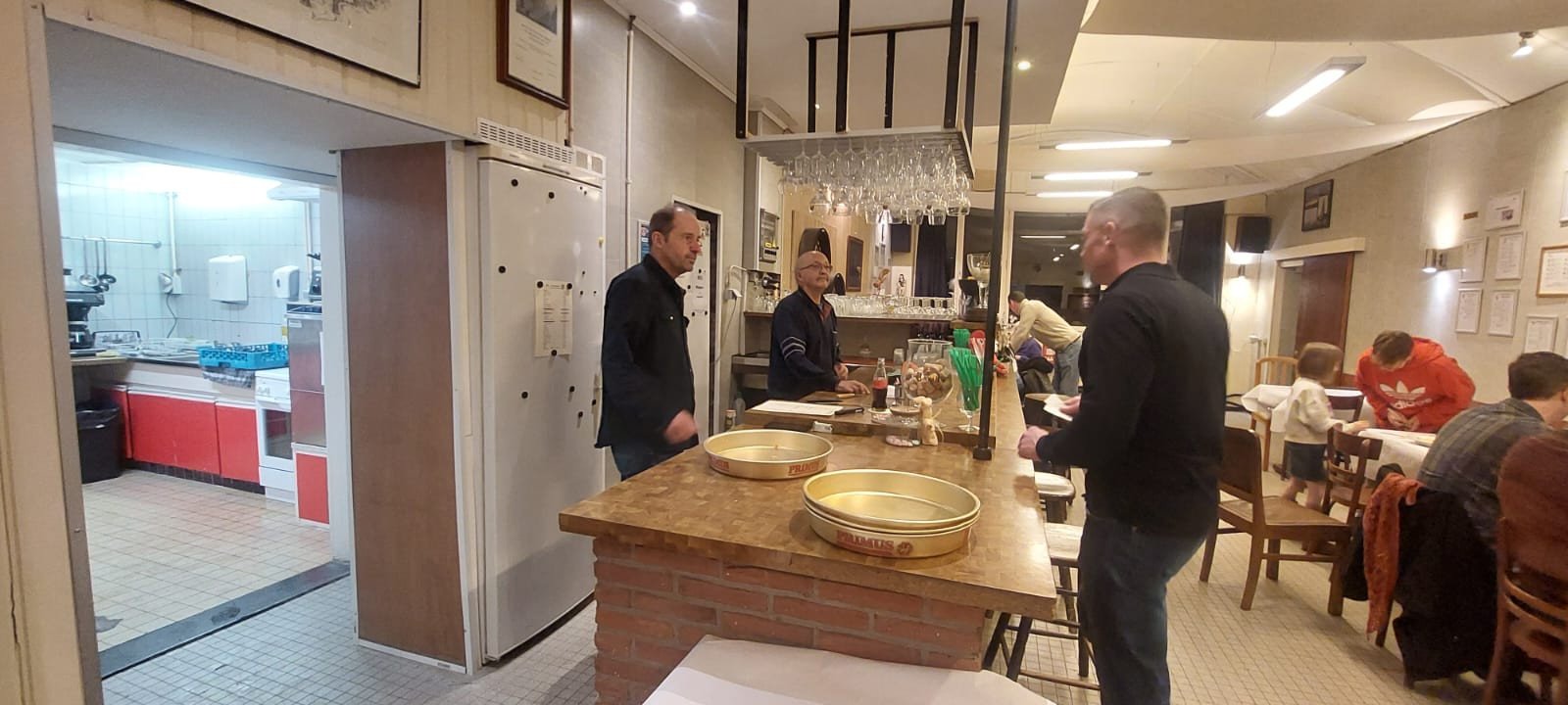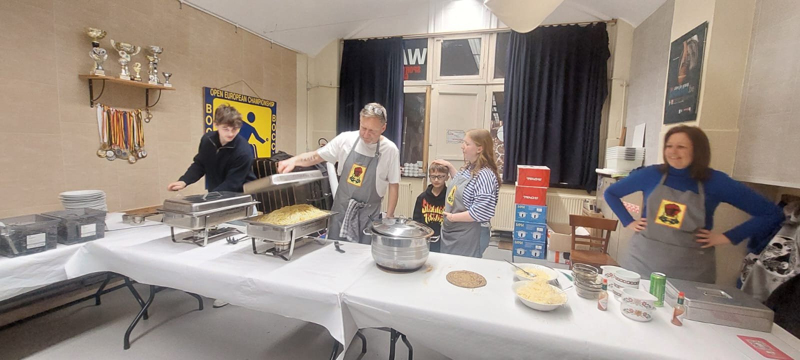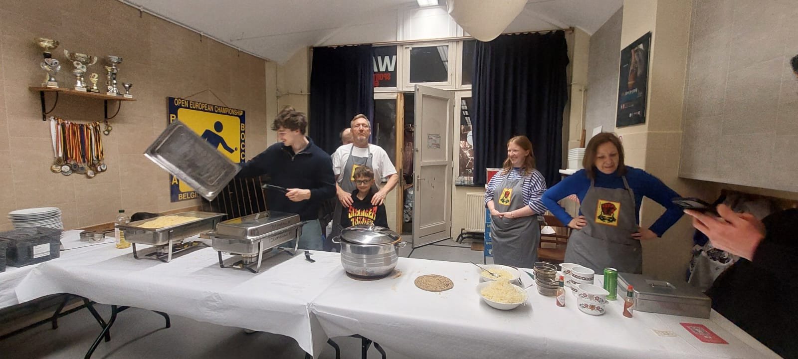 De zaal was sfeervol aangekleed met gezellige verlichting en prachtig gedekte tafels. De leden van Five Elements stonden al vanaf de vroege namiddag paraat om alles in goede banen te leiden: van het bereiden van de overheerlijke spaghetti en sauzen tot het warm bedienen van de gasten aan tafel. Christophe, die alles organiseerde, en zijn vrouw Danielle ontvingen ons aan de inkom. Met Michel en Wiet aan de toog en Amanda en Chris in de keuken draaide alles op rolletjes.