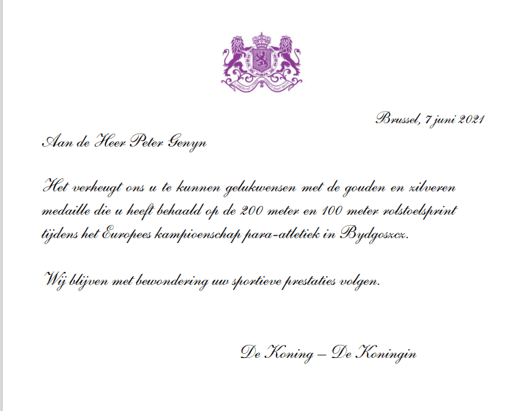 Peter Genyn uit Kalmthout stond op de slotdag van het Europees kampioenschap in Bydgoszcz (Polen) met veel goesting aan de start van de 100 meter rolstoelsprint, nadat hij eerder deze week zijn rivaal Toni Piispanen klopte op de 200 meter. Piispanen is wel de regerende wereldkampioen op de 100 meter en dus was het toch spannend uitkijken naar deze wedstrijd.